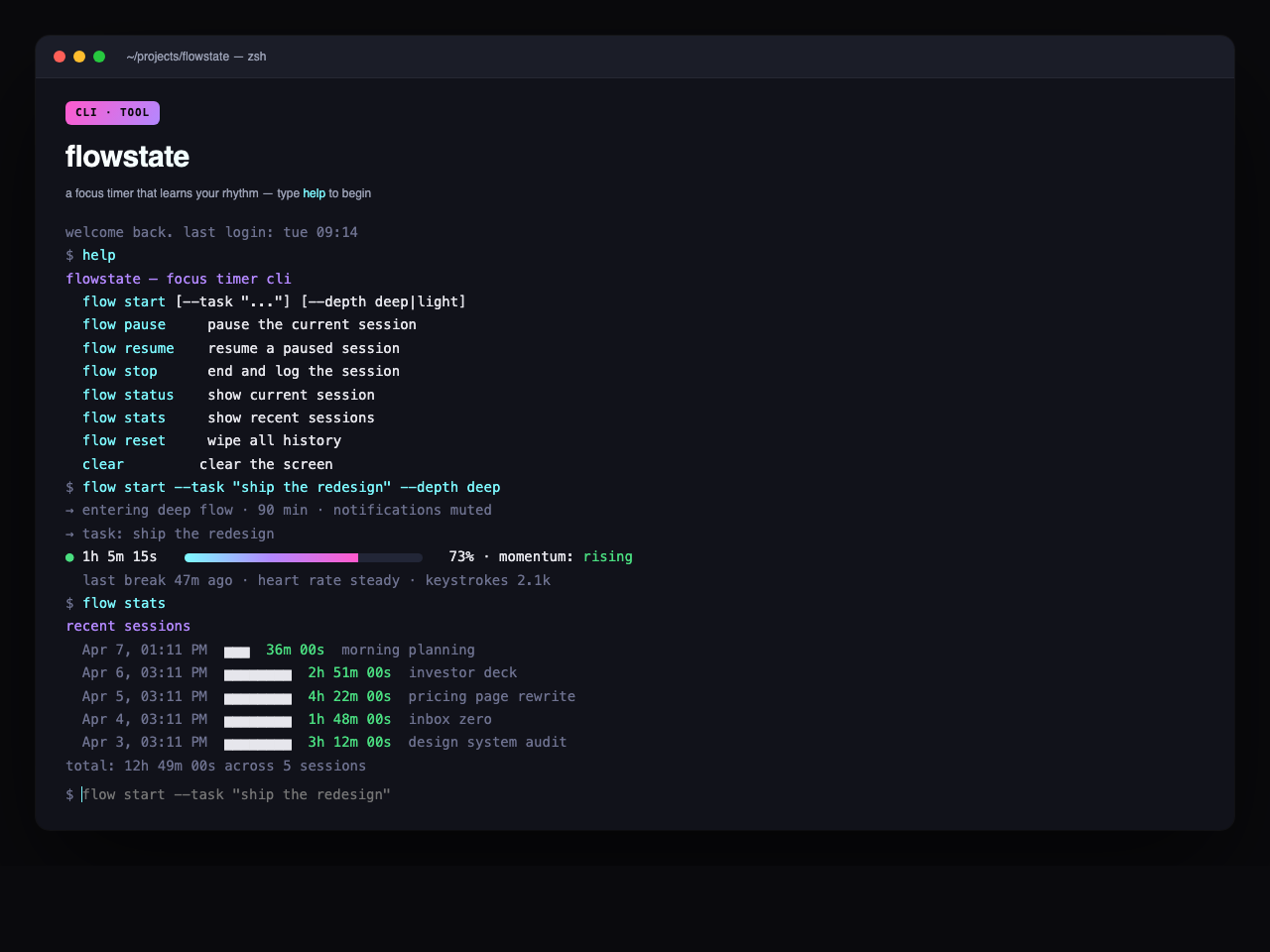 The 'flowstate' tool is implemented entirely in a single HTML file, leveraging HTML, CSS, and JavaScript. It presents a terminal-like interface to the user, complete with a command prompt, output log, and visual elements mimicking a terminal window. The JavaScript handles command parsing, state management for the focus timer (running, paused, task details, elapsed time), and interaction with the browser's local storage to save and retrieve session history. It supports commands like 'flow start', 'flow pause', 'flow resume', 'flow stop', 'flow status', 'flow stats', 'flow reset', and 'clear'. The interface includes visual feedback for the timer's progress and momentum. The code also includes a demo mode that seeds the interface with example output and session history upon initial load.
