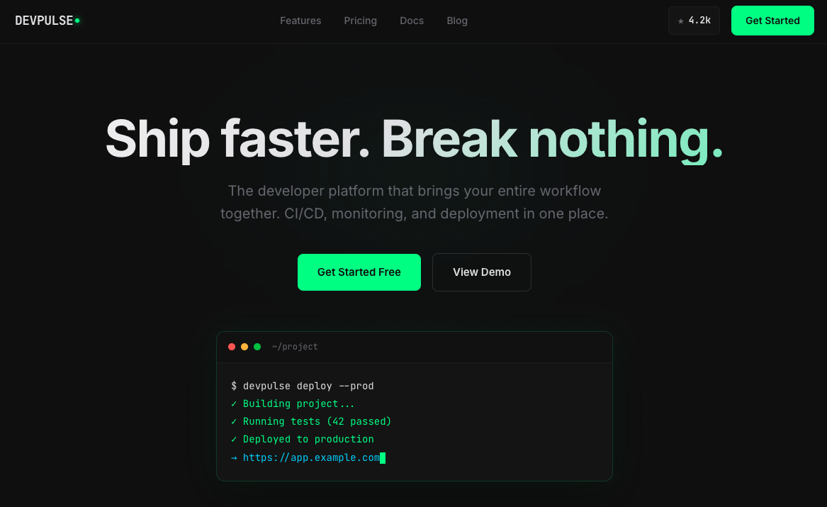 The template is a single HTML file that includes all the necessary HTML structure and inline CSS for styling. It utilizes a dark theme with vibrant accent colors, inspired by modern developer tools. Key features include: a sticky navigation bar with a mobile toggle, a hero section with animated text and a simulated terminal output, a grid of feature cards, statistics, pricing tables with a monthly/annual toggle, testimonials, and a prominent call-to-action. The CSS incorporates responsive design principles, animations for scroll-revealing elements, a blinking cursor effect for the terminal, and a counter animation for statistics. Basic JavaScript is included to handle the mobile menu, pricing toggle, and smooth scrolling.
