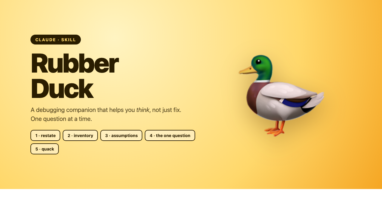 The Rubber Duck skill is designed to assist users who are stuck or debugging code. It implements a 'Quack Protocol' that guides the user through a series of steps: first, restating the problem in a single sentence to ensure understanding; second, inventorying all previously attempted solutions and their outcomes; third, surfacing and verifying implicit assumptions made about the problem; and finally, asking one single, focused question to help the user gain clarity. The skill strictly avoids proposing solutions until the user has had an opportunity to identify the issue themselves, aiming to foster independent problem-solving.