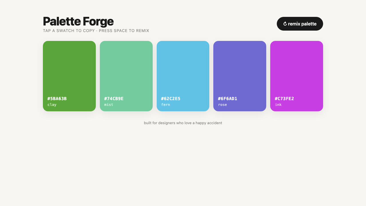 This submission is a self-contained HTML file that functions as a color palette generator. It uses JavaScript to create a visually appealing grid of color swatches. Each swatch displays its hex code and a randomly assigned name from a predefined list. The application allows users to generate new palettes by clicking a 'remix palette' button or by pressing the spacebar. Clicking on a swatch copies its hex code to the clipboard. The styling is done inline using CSS within the HTML file.