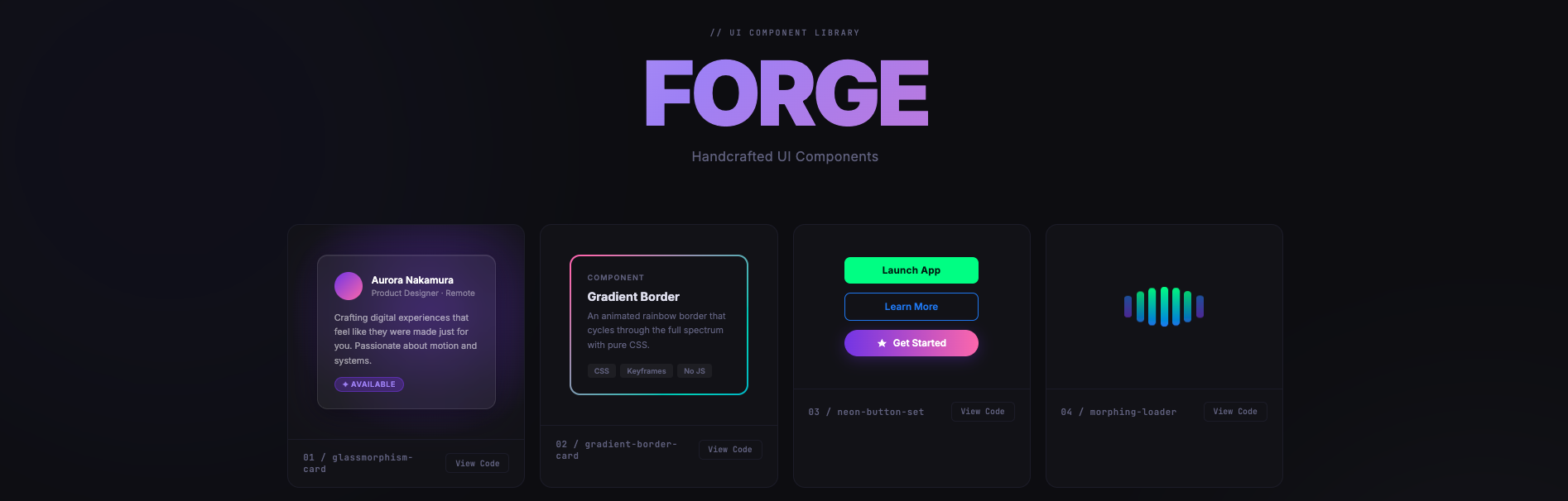The FORGE UI Component Showcase is a single HTML file demonstrating a variety of visually rich UI elements. It features a dark, futuristic theme with vibrant accent colors and smooth animations. The components include: