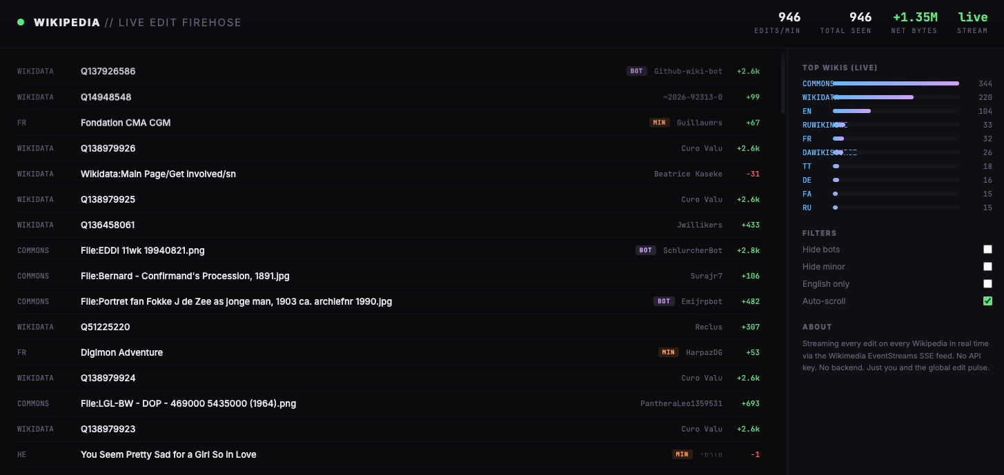 A real-time, client-side dashboard displaying live edits from Wikipedia using the Wikimedia EventStreams SSE feed.
